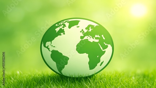 Green earth globe resting on lush green grass with soft bokeh background and bright sunlight