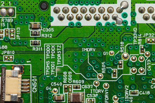 Green electronic board with radioelements close-up. Background for the theme of electronics and high tech equipment