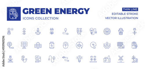 Green energy icons collection. Thin Line icons, editable stroke. green energy, renewable energy, hydrogen, biomass energy, electric car, eco energy, solar energy