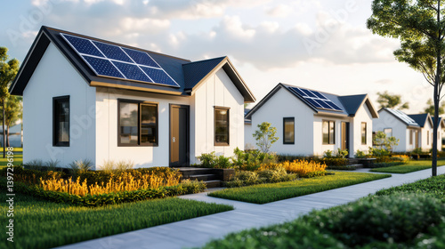Green Energy Innovation Concept, Eco friendly houses with solar panels in green neighborhood, Sustainable Future.