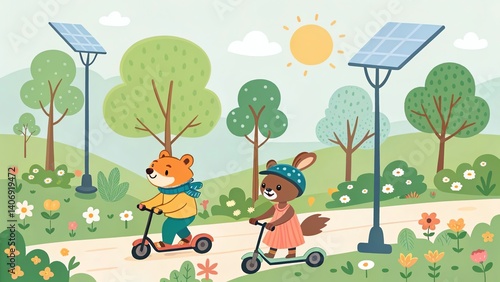 Green energy reduce carbon emissions and makes earth cleaner and more ecological, vector of happy cartoon animals riding electric scooters and bikes in a green park with solar-powered streetlights