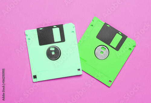 Green floppy disks on pink background. Computer technology 80s. Top view.
