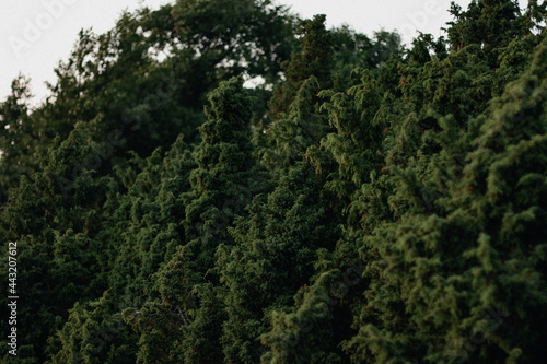 green forest, lush with coniferous foliage and shrub texture in summer nature