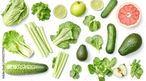 Green fruit and vegetable mix collection. Celery, apple, avocado, cucumber, bean, rucola, grape, bok choy, lime, grapefruit, kiwi, pepper isolated on white background. Creative layout. Flat lay