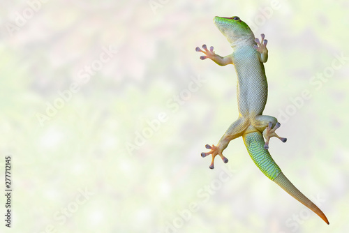 Green gecko lizard on glass on a white background. Pet in the terrarium.