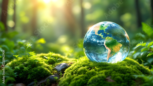 Green globe on moss in forest, environmental concept, earth day, save trees, forest day, global warming.
