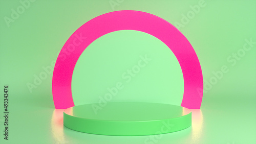 Green glossy podium, pedestal on green pink background. Blank showcase mockup with empty round stage. Abstract geometry background. Stage for advertising product display with copy space.3d render