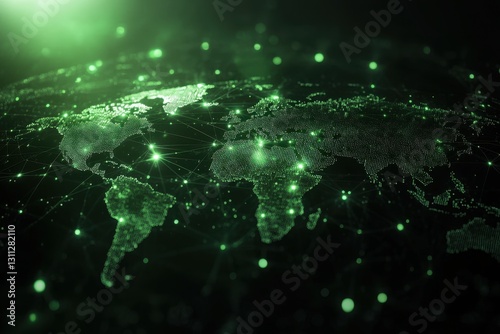 Green glowing world map, connected by lines. Illustrates global network, data flow, and connectivity.