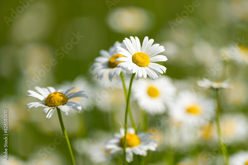 Green grass and chamomile in the meadow. Chamomile field. Daisies background. Chamomile flowers field in sunlight. Beautiful nature scene. Summer background.