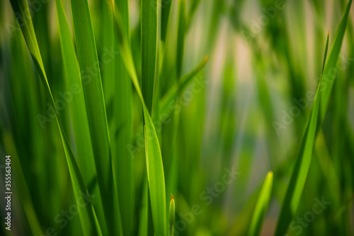 Green Grass. Close-up of bright green grass tending a breath of wind. Close-up abstract with shallow depth of field and background bokeh of brightly sunlit long bladed green and yellow plant leaves.