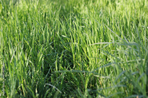 Green grass. Grass texture. Field with green grass. Field of fresh green grass as a background. Sunny green grass