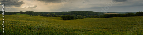 green hilly corn field with forests under a cloudy sky. widescreen panoramic side view. evening agricultural landscape