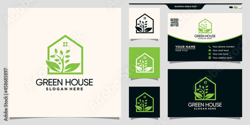 Green house logo with natural leaf concept and business card design Premium Vector