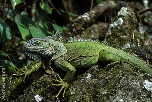 Green iguana perched on a mossy rock, displaying its vibrant scales and blending into the forest environment. ai