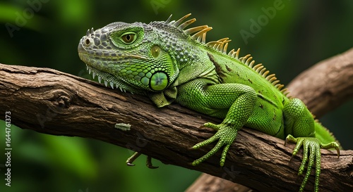 Green Iguana Resting on Branch, Detailed Scales and Spikes, Tropical Wildlife