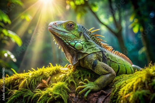 Green Iguana Resting on Tree Trunk, Tropical Wildlife Portrait