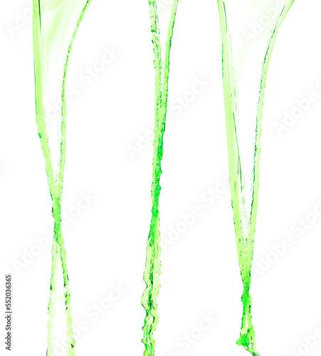 Green juice from nature splash in Air. Water green leaf pour from sky and purify clean natural. Many shape form of water splashing flow over White background Isolated.