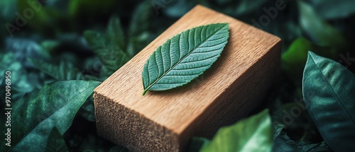 Green leaf icon on a wooden block, set among dense foliage, representing carbon neutrality, net zero emissions, and commitment to environmental sustainability