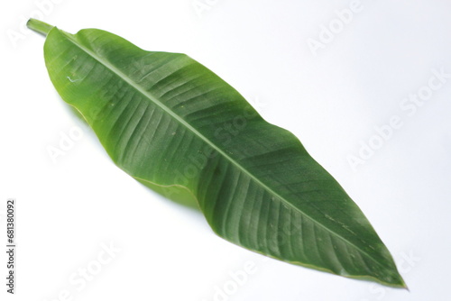 Green leaf on white background with copy space for text or image, leaf bird of paradise, isolate