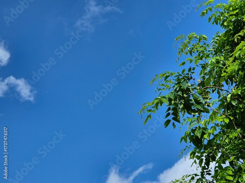 Green leafy tree branches against bright blue sky with scattered white clouds on sunny day