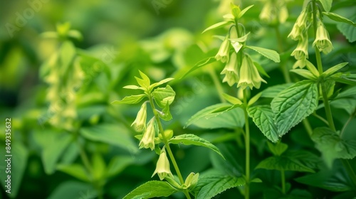 Green leaves and delicate bell shaped flowers of cathedral bells