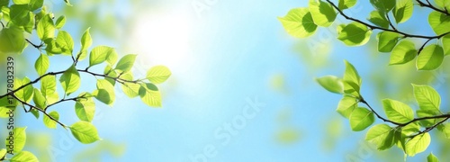 Green leaves and tree branches under clear blue sky on sunny day. Perfect concept for spring outing, syrup season, summer joy, fruit farm. With copy space for text addition.
