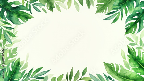 Green leaves arranged beautifully around a blank space, perfect for text or graphics. The leaves exhibit various shapes and shades of green, creating a refreshing and natural look