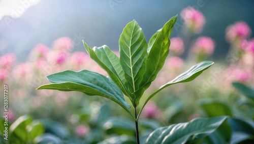 Green leaves close-up with blurred pink flowers in the background and soft sunlight illuminating the scene in a natural environment