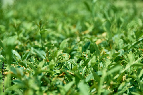 green leaves exposed to direct sunlight in the morning with a bokeh background.