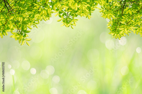 green leaves frame and blur green grass bokeh background with copy space for your designed.