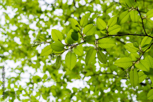 Green leaves on a branch. The nature of Transcarpathia. Spring trees in the forest. Leaf tree branch in summer. Fresh spring photo. Summer. Leafing close up. Bokeh in the background. Flora of Ukraine.