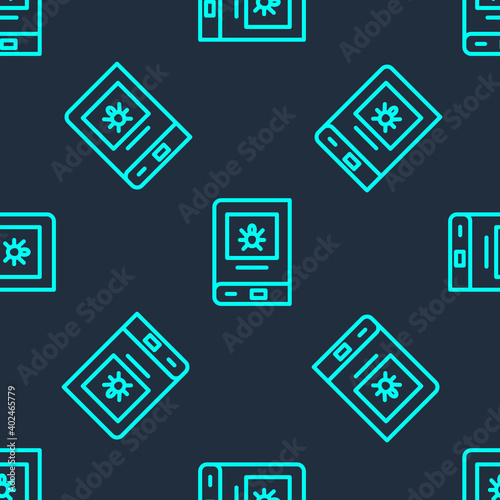 Green line Book about insect icon isolated seamless pattern on blue background. Vector.