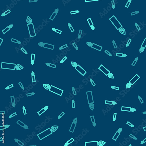 Green line Burning candle icon isolated seamless pattern on blue background. Cylindrical candle stick with burning flame. Vector