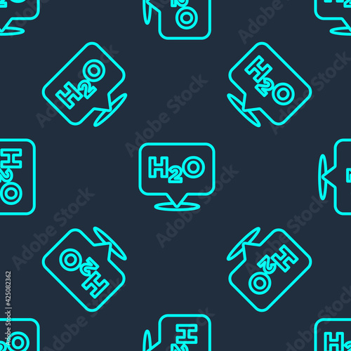 Green line Chemical formula for water drops H2O shaped icon isolated seamless pattern on blue background. Vector