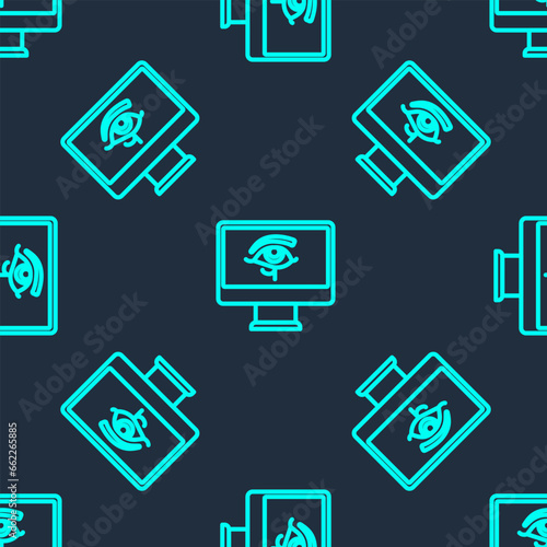Green line Eye of Horus on monitor icon isolated seamless pattern on blue background. Ancient Egyptian goddess Wedjet symbol of protection, royal power and good health. Vector