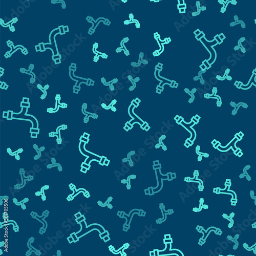 Green line Industry metallic pipe icon isolated seamless pattern on blue background. Plumbing pipeline parts of different shapes. Vector.