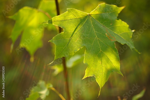 green maple leaves on branches in the forest, macro photo