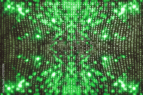 Green matrix digital background. Abstract cyberspace concept. Characters fall down. Matrix from symbols stream. Virtual reality design. Complex algorithm data hacking. Green digital sparks.