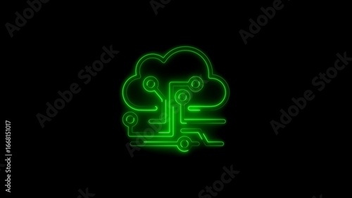 Green Neon Cloud Computing Icon With Circuit Board Elements On Black Background technology