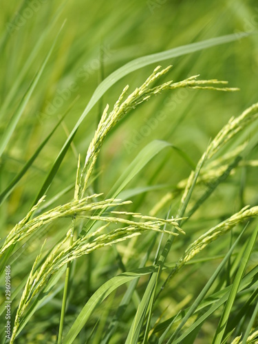 green paddy rice in the field plant, Jasmine rice on blurred of nature background