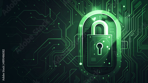 Green Padlock on a Digital Circuit Board, perfect for online security services, encryption solutions, and cyber protection ads