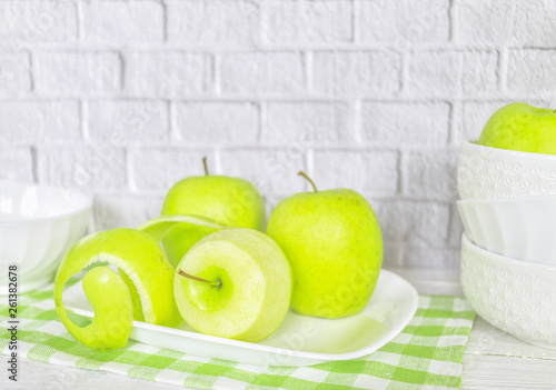 green peeled and untreated apples in a plate on the kitchen table. background with green apples close-up.