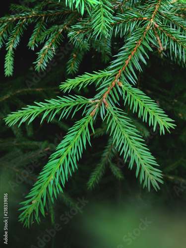 Green pine tree brunches with needles closeup. Green spruce after rain in the wood. Pine tee texture background.