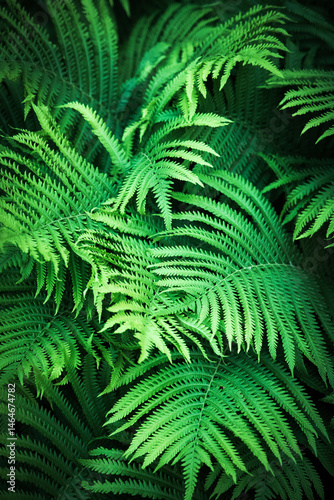 Green plant background of fern leaves. Shallow depth of field. Selective focus on the center of the composition.