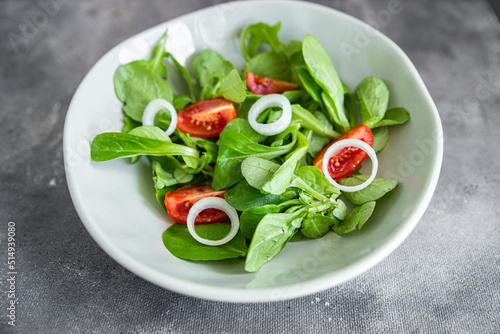 green salad vegetable tomato, onion, lettuce mix, mache green fresh healthy meal food snack diet on the table copy space food background rustic top view