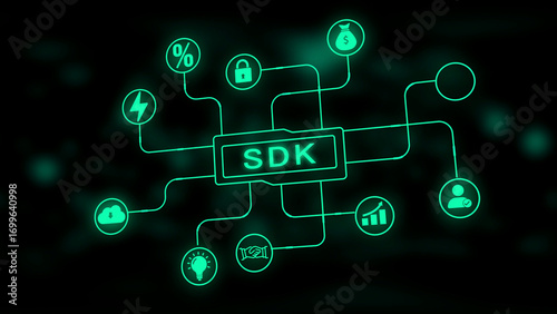 Green SDK diagram with connected icons on dark background software development kit programming