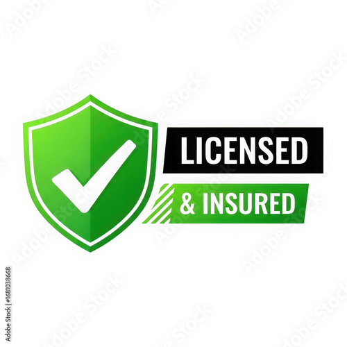 Green shield with checkmark and text licensed insured isolated on transparent background