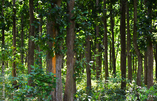 Green shorea robusta tall sal trees on top of a hill mountain forest landscape with cloudy sky