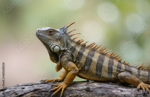 Green spiny tailed iguana perched on weathered tree branch in rich rainforest setting. Detailed macro shot captures reptile textured skin, sharp claws against soft, blurred background of tropical