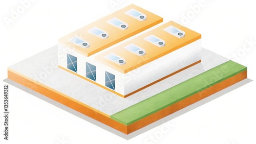Green Tech Concept. Modern Low Poly Building Design Isometric View of a Clean, Minimalist Structure with Orange Roof and Green Landscaping